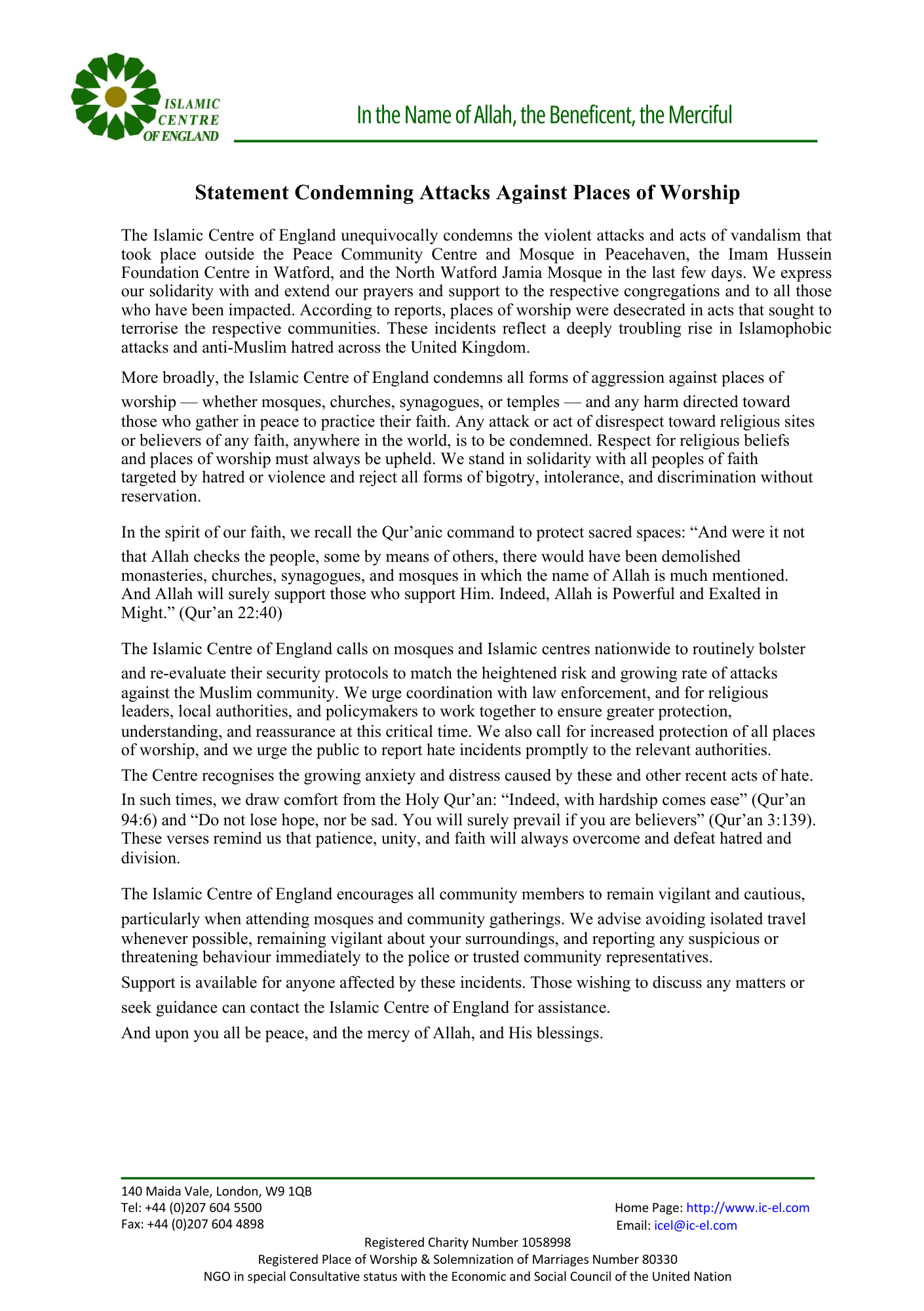 The Islamic Centre of England has issued a formal statement condemning the recent Islamophobic attacks targeting several places of worship across the United Kingdom, including the Peace Community Centre and Mosque in Peacehaven, the Imam Hussein Foundation Centre in Watford, and the North Watford Jamia Mosque.
