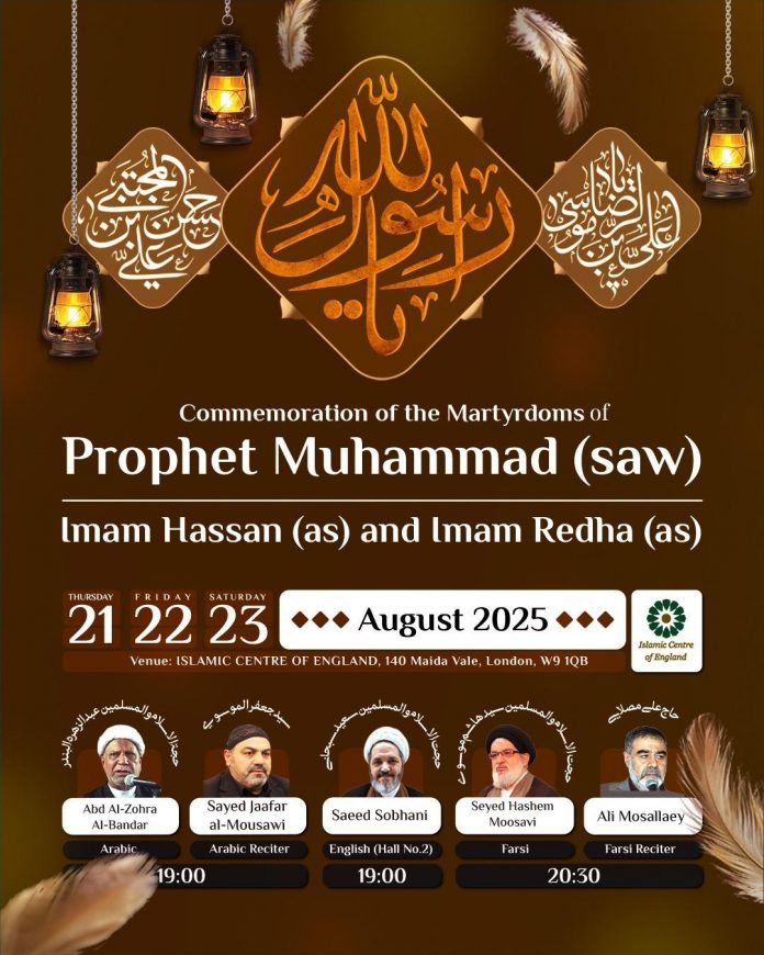 برنامه مراسم عزاداری رحلت پیامبر عظیم الشان اسلام و شهادت امام حسن مجتبی و امام رضا علیها سلام در مرکز اسلامی انگلیس – 2025