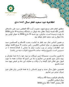 اطلاعیه عید سعید فطر سال 1447 ه ق برای اقامه نماز در مرکز اسلامی انگلیس – 2026